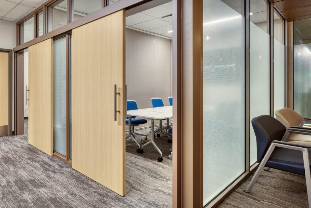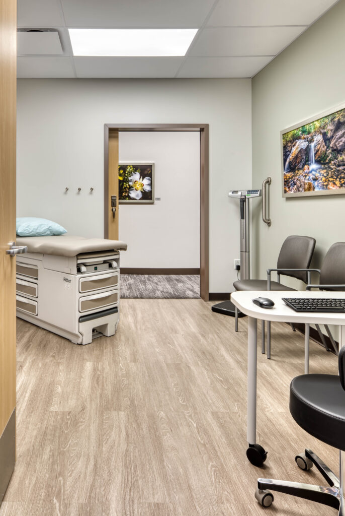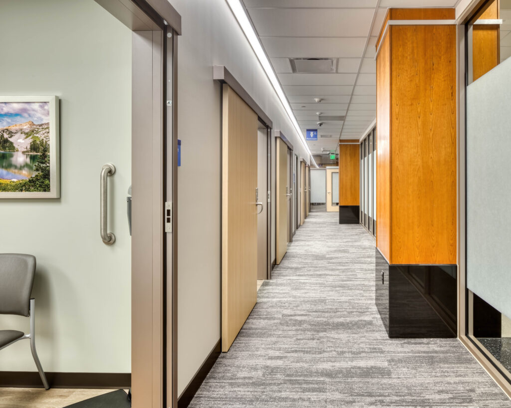 The smooth, space-saving operation of commercial sliding doors does more than contribute to more accessible and efficient exam rooms. It can also improve wayfinding by easing congestion and corridor blockage by more readily allowing dual-entry design. For the Medical Oncology Suite at Intermountain Cancer Center McKay-Dee Hospital, this supports the hospital’s goal of providing the best possible care to patients in a calming and supportive atmosphere.