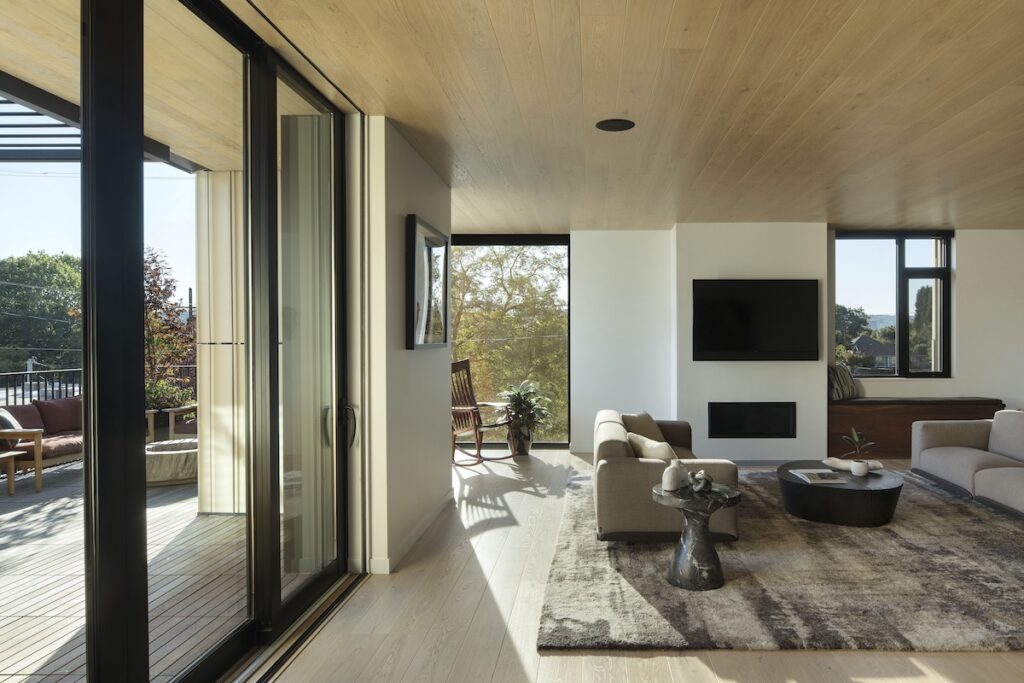 The building features a post-tensioned concrete frame; its top floor is built with cross-laminated timber (CLT) and wood beams. Prefabrication with CLT and terra cotta helped minimize fieldwork, shortening the construction window while reducing costs. Other building materials include thermally efficient fiberglass windows, metal trellises and guardrails, and Ipe decking. Below the building is a small, underground parking garage.